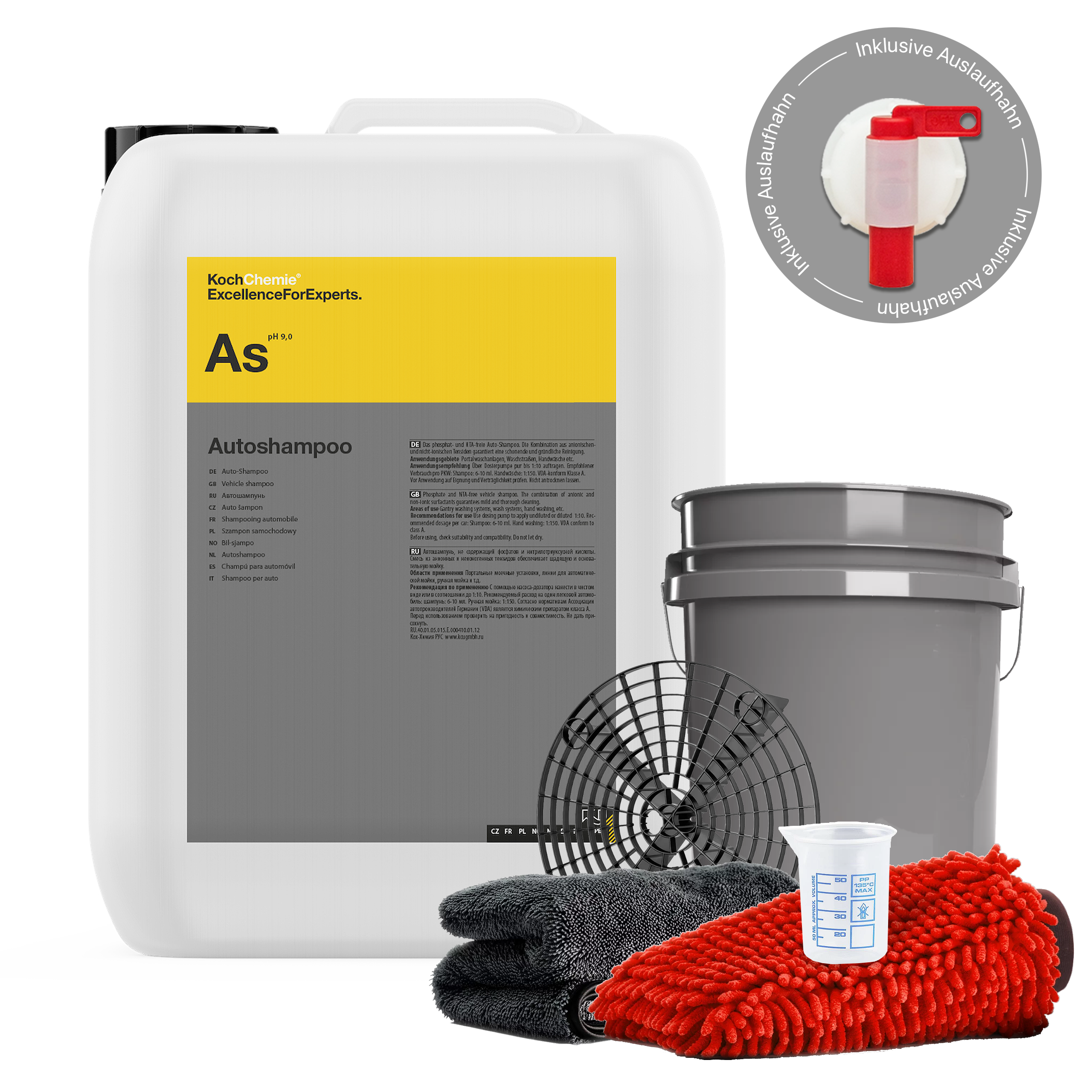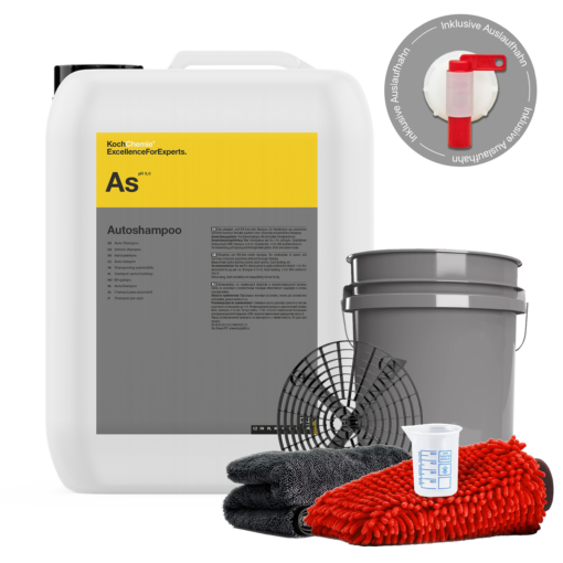 Dieses Set umfasst Koch Chemie Autoshampoo im Kanister, das Basis-Shampoo für die tägliche Autowäsche, gerade in der gewerblichen Autoaufbereitung.