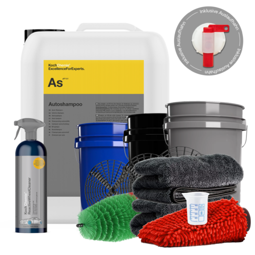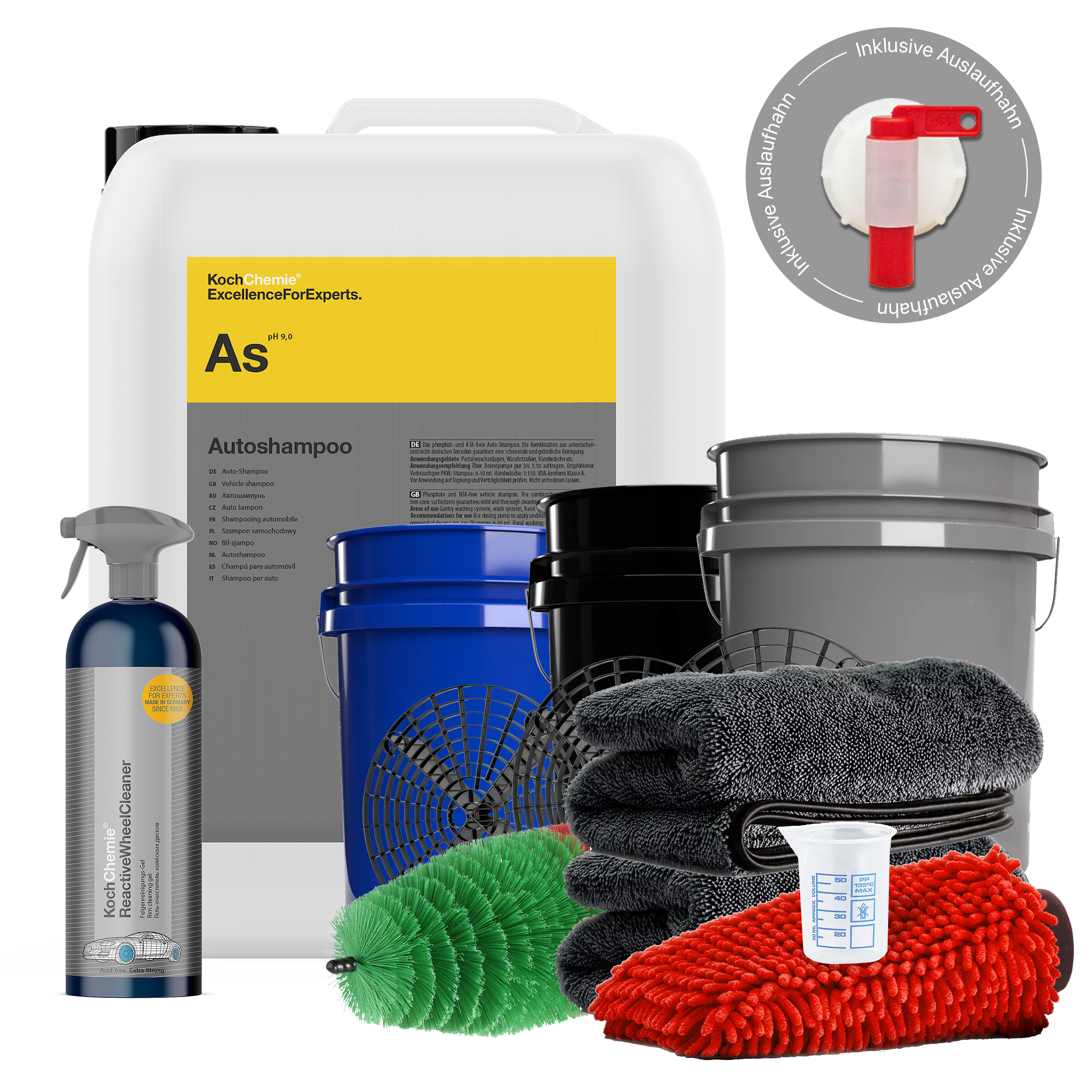 Dieses Set umfasst neben dem Koch Chemie Autoshampoo im Kanister, das Basis-Shampoo für die tägliche Autowäsche, zusätzlich den Koch Chemie ReactiveWheelCleaner.