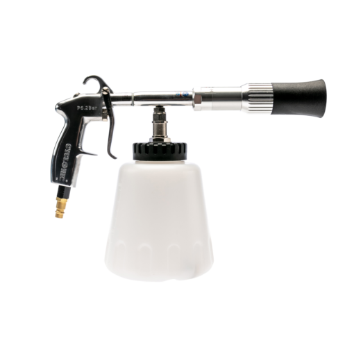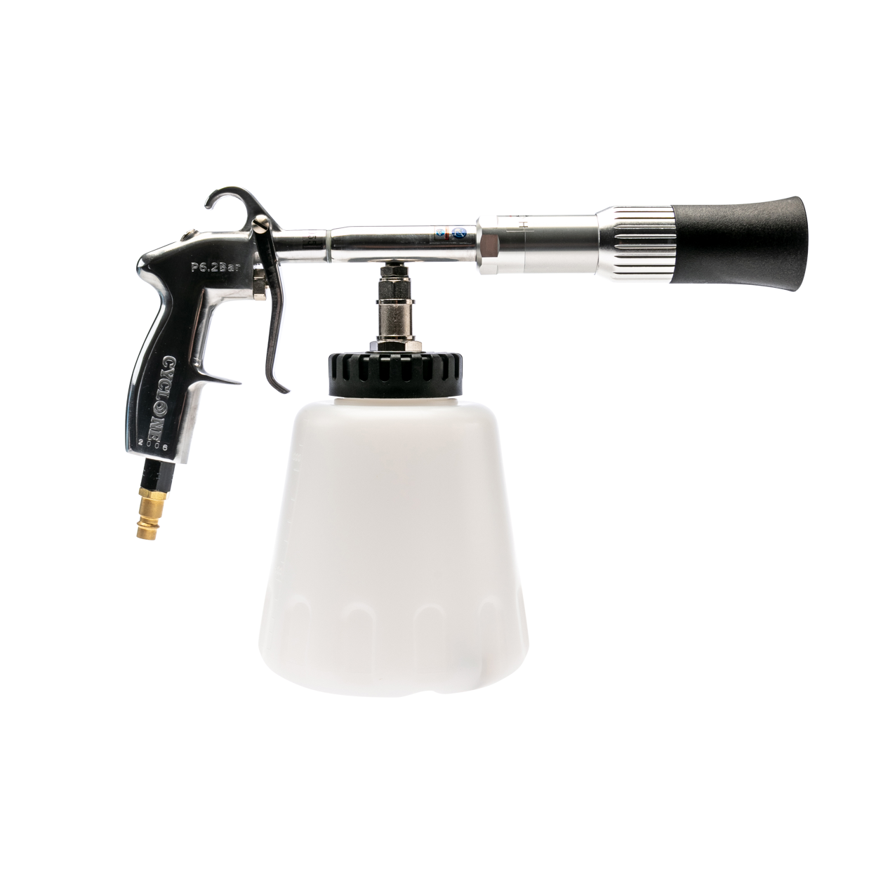 Die Koch Chemie Cyclone AZ2000 ist eine Reinigungspistole für schnelle und ökonomische Reinigungsergebnisse. Basierend auf der innovativen Turbinentechnologie, die einen Tornado Effekt erzeugt. Dabei wird ein Luftwirbel erzeugt, welcher sich mit bis zu 8000 Umdrehungen pro Minute um sich selbst dreht. Hierdurch wird die gelöste Verunreinigung von der Oberfläche durch den entsehenden Unterdruck von der Oberfläche entfernt. Die Drehzahl lässt sich über den Lufttrichter steuern. Je nach Einstellung und der daraus resultierenden Geschwindigkeit passt sich auch das Reinigungsergebnis an.