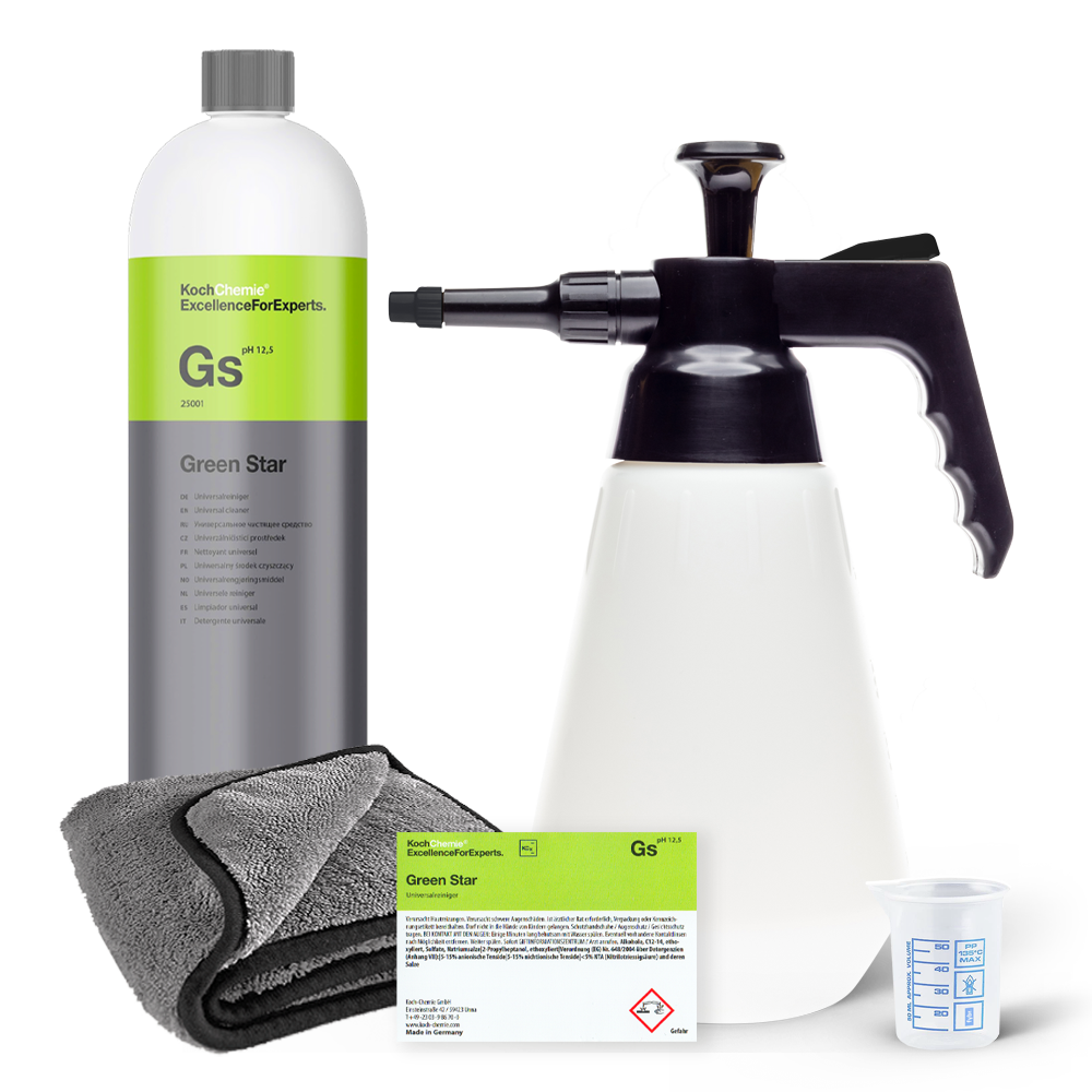 In unserem Set bieten wir den legendären Green Star Universal-Reiniger zusammen mit dem passendem Messbecher und dem Aufkleber für die Kennzeichnung der Flasche an.