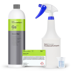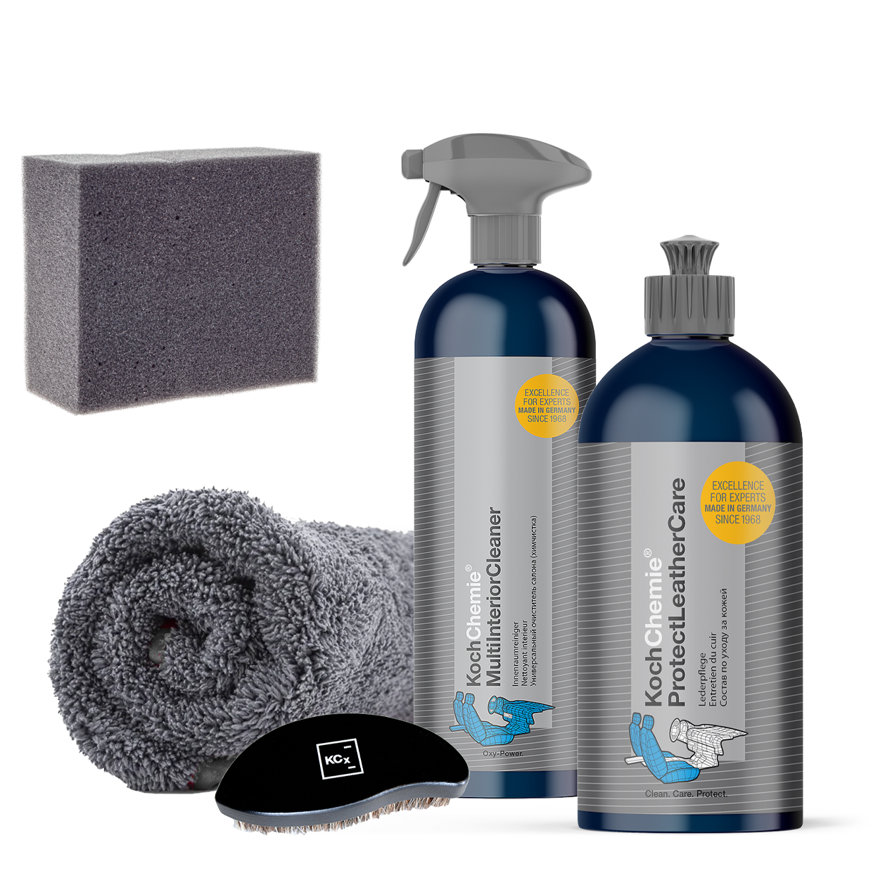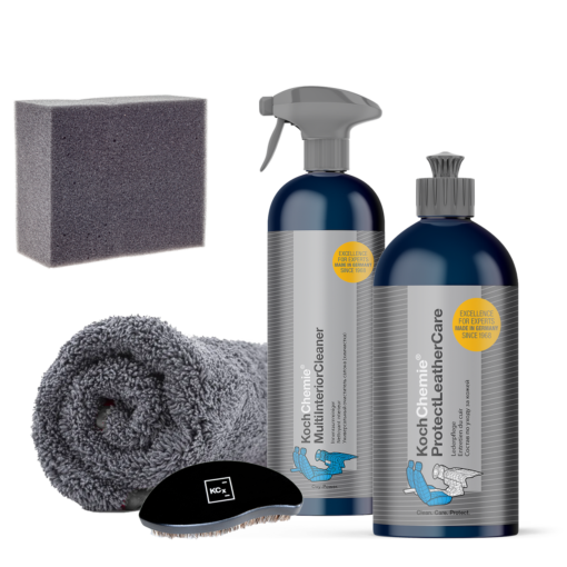 Das Leather Set von Koch Chemie umfasst den Koch Chemie MultiInteriorCleaner und den LeatherStar. Ersteres ist das Reinigungsmittel für alle Oberflächen im Innenraum und zweites die hochwertige Lederpflege für das Rückfetten und Pflegen des empfindlichen Leders.