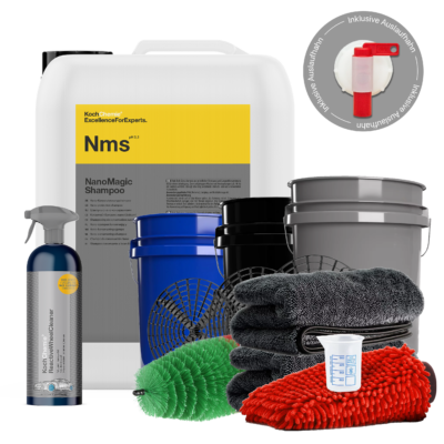 Dieses Set umfasst Koch Chemie NanoMagicShampoo im der Flasche, das Premium-Nano-Shampoo für die Versieglungswäsche mit Trocknungshilfe. Es wäscht einen Lackschutz aus innovativen Nano Partikeln auf den Lack, welcher diesen schützt und vorhandene Versiegelungen schützt. Die Formel ist leicht sauer hierdurch werden auch hochwertige Keramikversiegelungen nicht angegriffen.