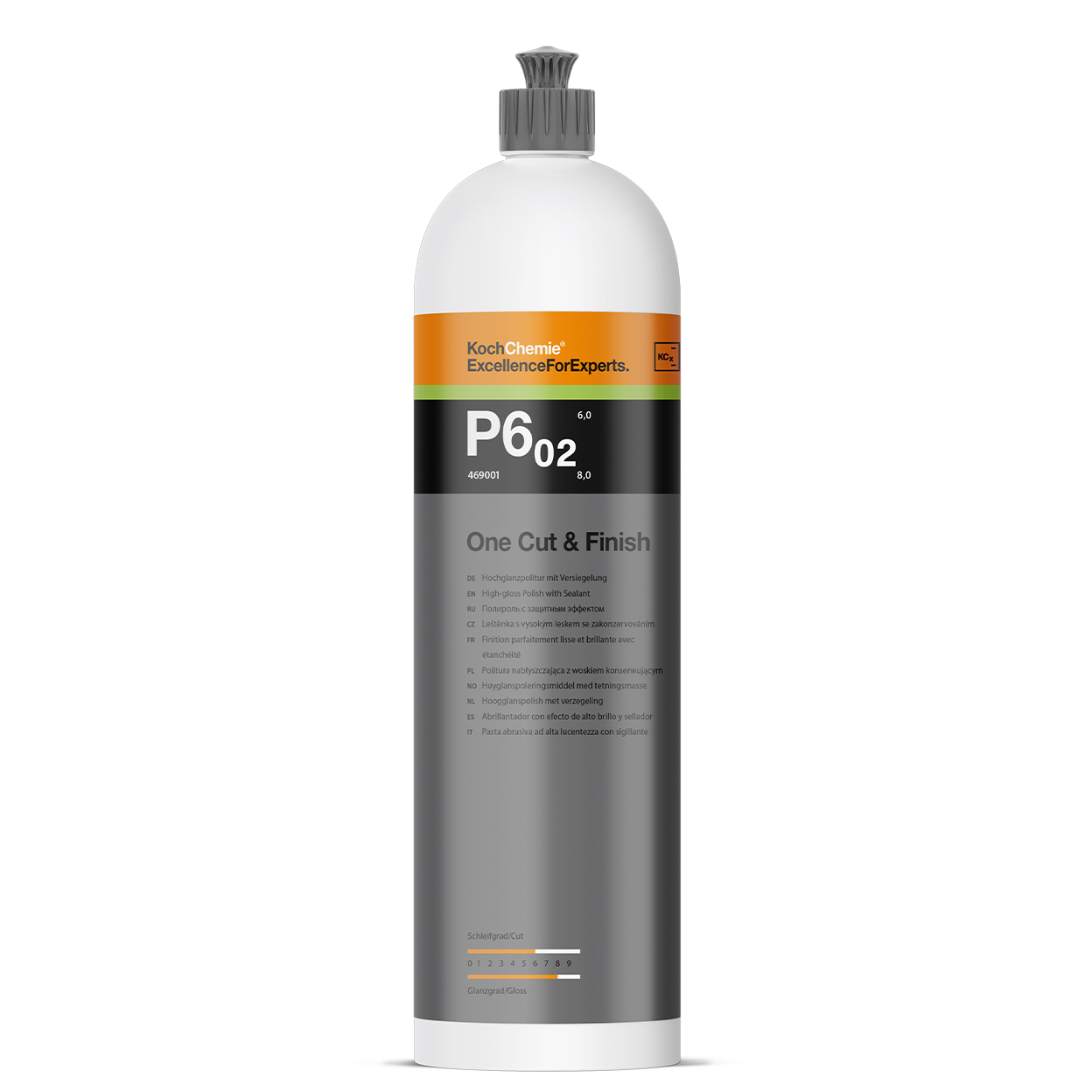 Die neue Koch Chemie One Cut & Finish P6.02 ist eine maschinelle Politur, die entwickelt wurde, um hartnäckige Polierschleier, Hologramme sowie Kratzer und Anschliffe ab Körnung P 2000 dauerhaft zu entfernen. Gleichzeitig verleiht sie der Oberfläche einen effektiven Versiegelungseffekt. Dank der gleichmäßigen Schleifkörner erzielen Sie ein strahlendes und lang anhaltendes Hochglanzfinish.