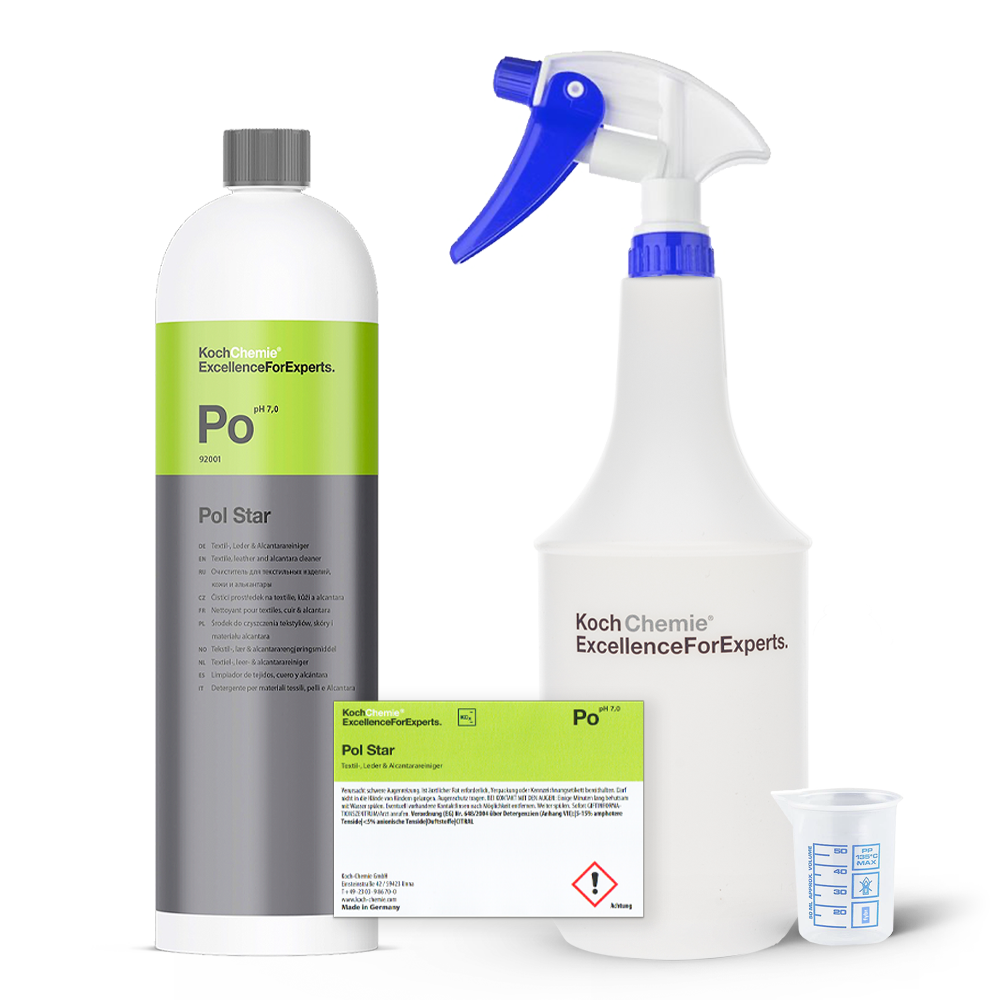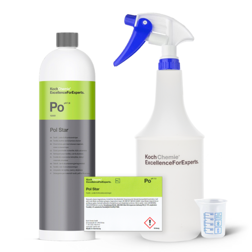 In unserem Set bieten wir den legendären Pol Star Innenreinigers zusammen mit der original Koch Chemie Sprühflasche, dem zugehörigen Sprühkopf, einem 50 ml Messbecher und dem Pol Star Aufkleber für die Kennzeichnung der Flasche an.