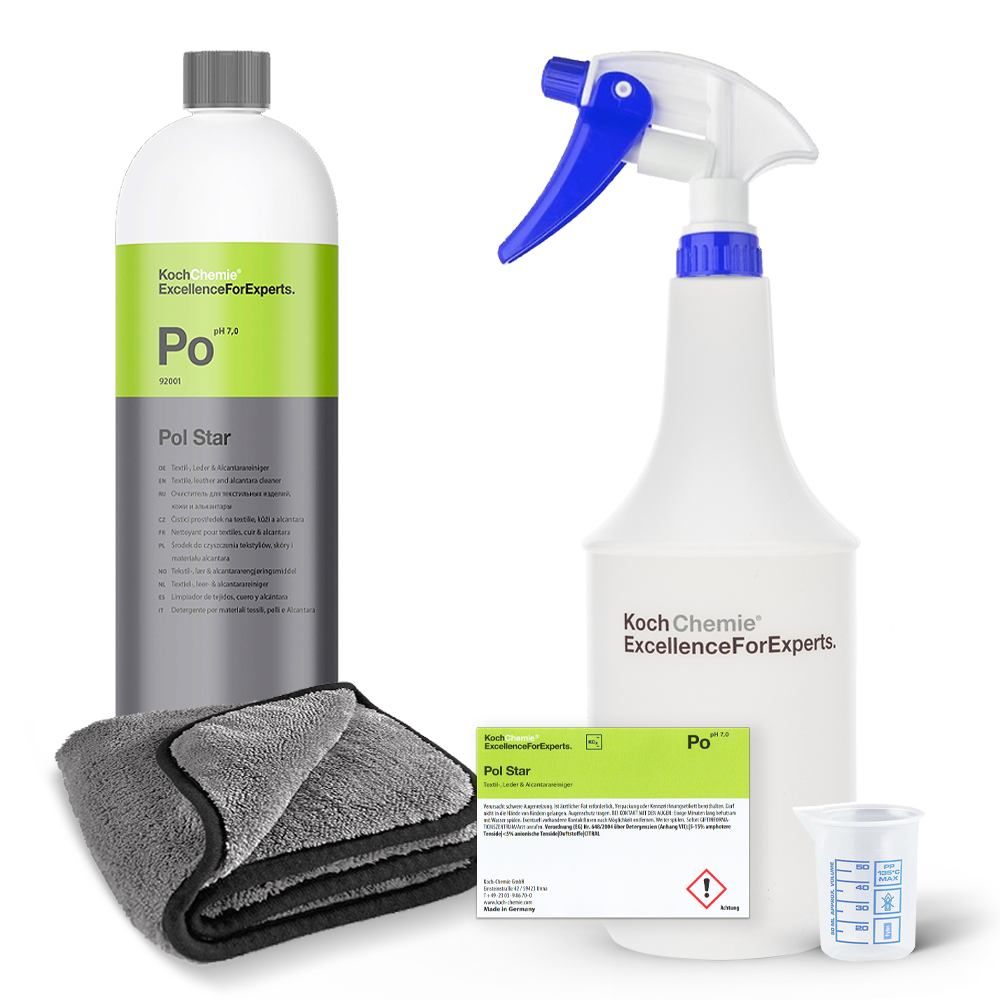 In unserem Set bieten wir den legendären Pol Star Innenreinigers zusammen mit der original Koch Chemie Sprühflasche, dem zugehörigen Sprühkopf, einem 50 ml Messbecher und dem Pol Star Aufkleber für die Kennzeichnung der Flasche an.