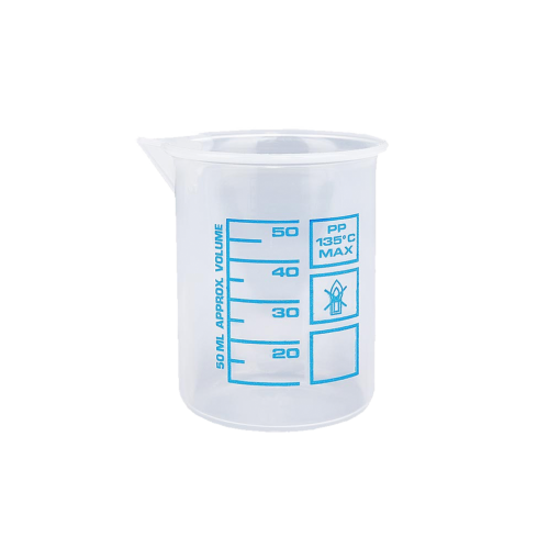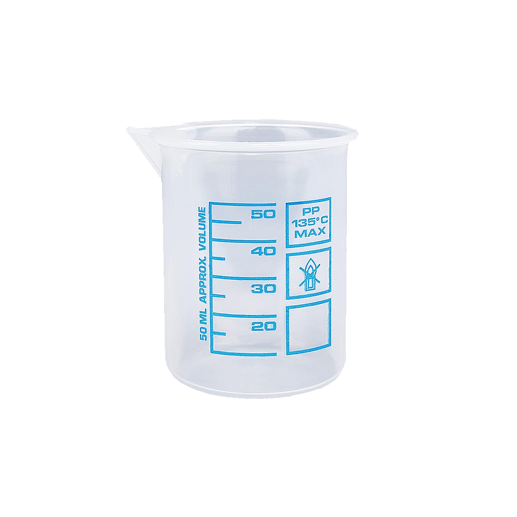 Der Profi-Messbecher fasst insgesamt 50 ml, ist aus Polypropylen, antistatisch, mit hoher Transparenz nach DIN 12.311, mit gradfreiem Bördelrand und mit gedruckter blauer Skala.